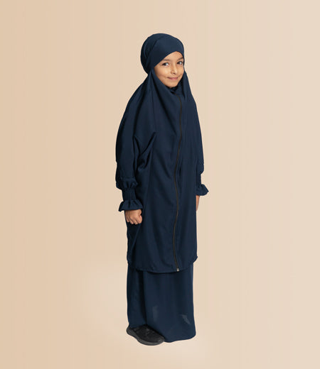 Introducing our Kids' Akhdar Jilbab with Full-Length Zip – style meets convenience! This elegant black jilbab is designed for children, featuring a full-length zip for easy dressing. Crafted with high-quality, breathable fabric, it ensures all-day comfort for your little ones. Elevate their wardrobe with this fashionable and practical piece